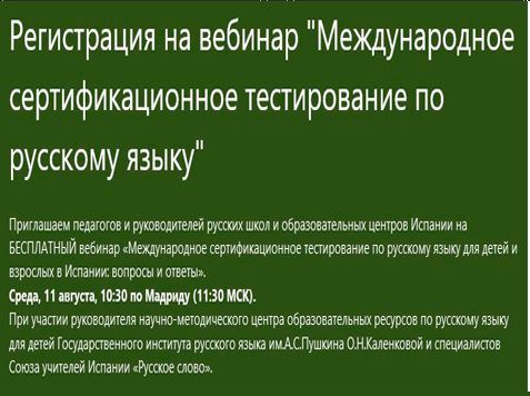 Приглашаем педагогов и руководителей русских школ и образовательных центров Испании на БЕСПЛАТНЫЙ вебинар ««Международное сертификационное тестирование по русскому языку для детей и взрослых в Испании: вопросы и ответы». Среда, 11 августа, 10:30 по Мадриду (11:30 МСК).